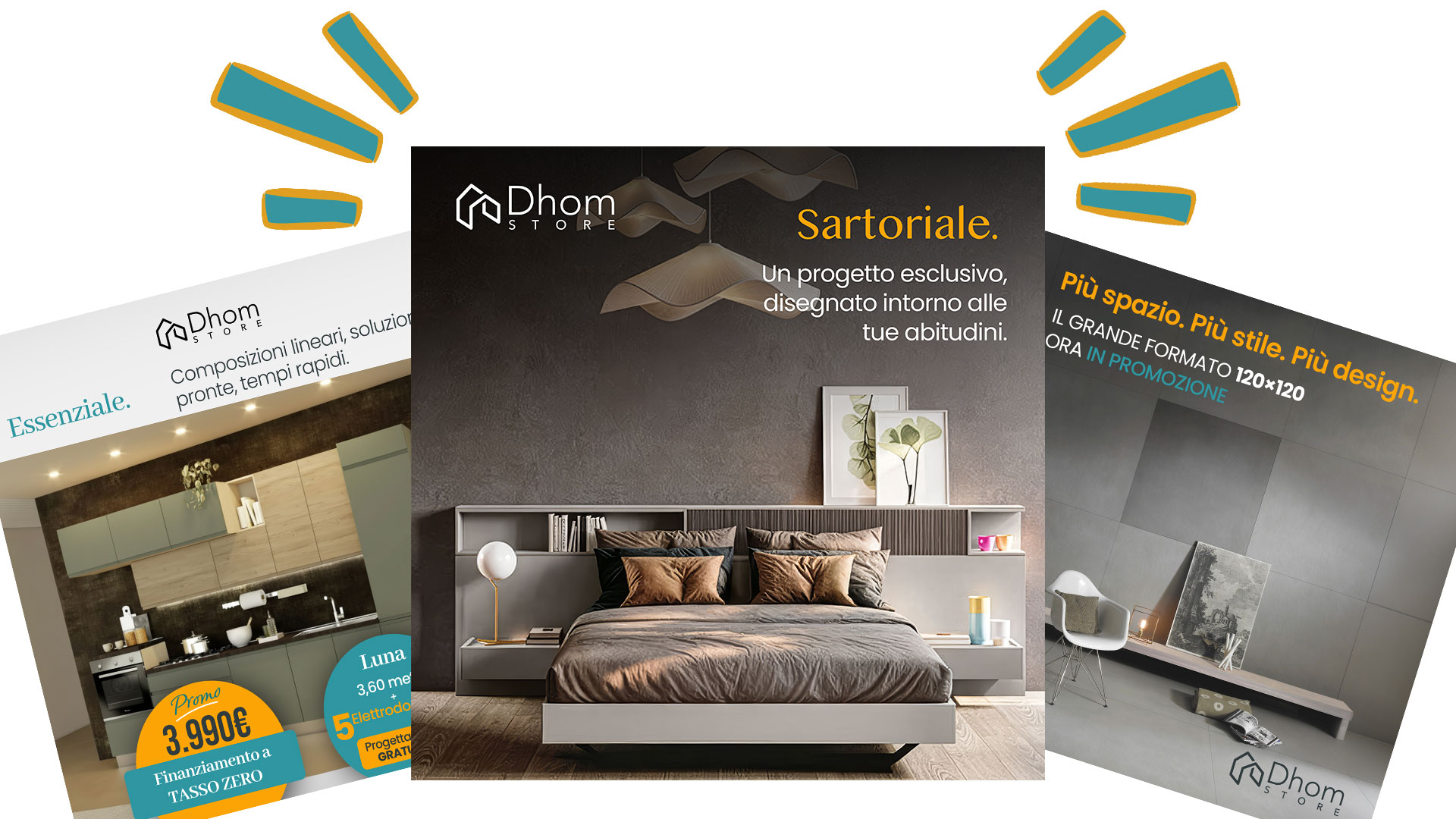 Dhom propone cucine, camere, living, bagni, pavimenti e rivestimenti, decor, tavola e tessile.