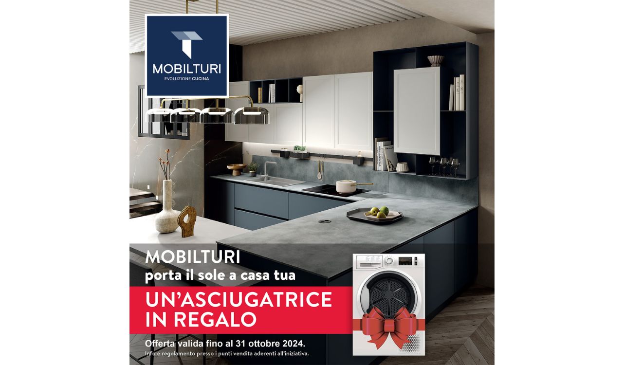 La promozione prevede sull’acquisto di una cucina Mobilturi completa di top e 3 elettrodomestici dello stesso marchio, un’asciugatrice in regalo. L’asciugatrice sarà consegnata del marchio secondo la disponibilità in magazzino, indipendentemente dal marchio degli elettrodomestici della cucina ordinata.