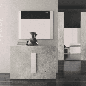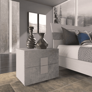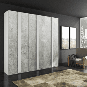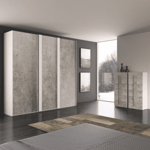 Ci sono mille modi per arredare una camera da letto; uno di questi è scegliendo finiture materiche di tendenza. L’abbinamento dell’essenza larice bianco con il cemento conferisce alla collezione Modena un carattere deciso e originale. Di seguito vengono proposte diverse composizioni complete di gruppi, letto, specchiera e armadiatura battente o scorrevole a tre ante.