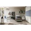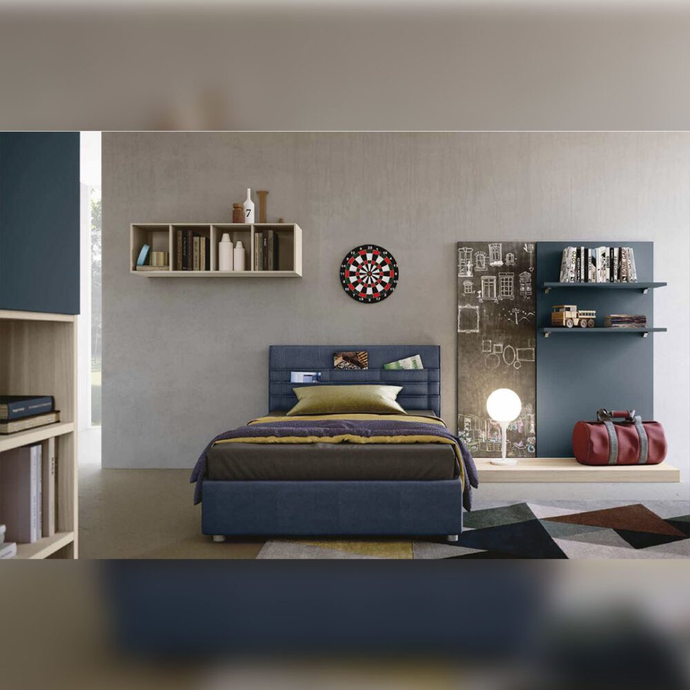 Cameretta composta da un letto dotato di una funzionale testiera con tasche, da zona contenitore da un lato e angolo studio dall’altro.