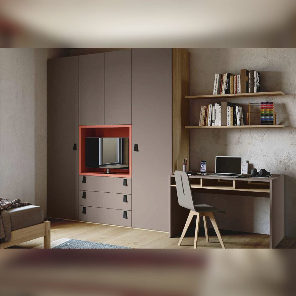 Soluzione perfetta per ogni gusto e necessità, la composizione ti permette di personalizzare i tuoi spazi con equilibrio ed estrema praticità, disponendo separatamente libreria e angolo studio, letto e un capiente armadio con vano Tv.