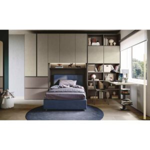 Ideale per arredare piccole camerette, questa soluzione salvaspazio permette di combinare uno stile raffinato ed elegante al minor ingombro possibile, con spazi contenitivi aggiuntivi che consentono uno sviluppo orizzontale delle forme.