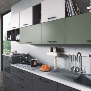 La cucina Ambra si impreziosisce di elementi living come i pensili larghi 30 cm e alti 96 cm