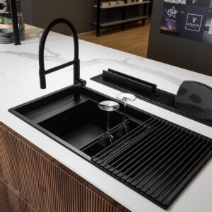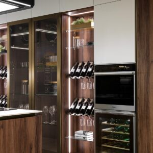 La cucina Onda di Mobilturi è caratterizzata da un design elegante e funzionale, con ante cannettate in MDF da 22 mm rivestite in PET. È disponibile in vari colori e finiture, come bianco opaco, perla opaco, verde opaco, grafite opaco, oro metal, bronzo metal, rovere light, e rovere tabacco.