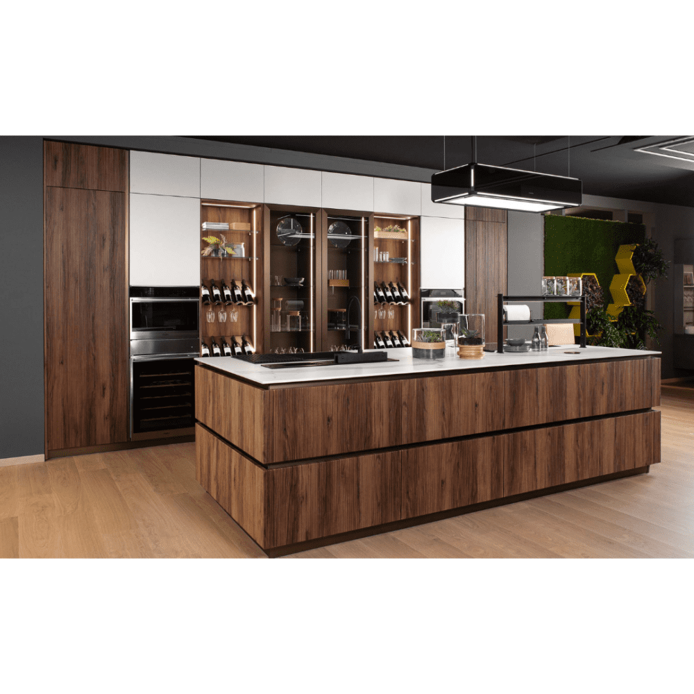 La cucina Onda di Mobilturi è caratterizzata da un design elegante e funzionale, con ante cannettate in MDF da 22 mm rivestite in PET. È disponibile in vari colori e finiture, come bianco opaco, perla opaco, verde opaco, grafite opaco, oro metal, bronzo metal, rovere light, e rovere tabacco.