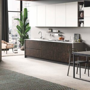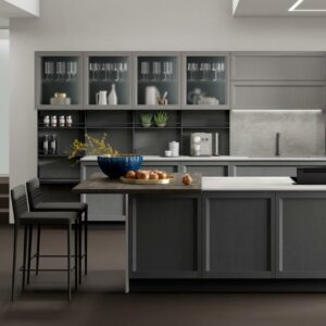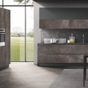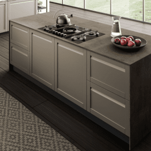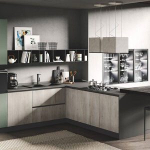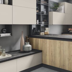 La cucina Star di Mobilturi combina eleganza e funzionalità, caratterizzata da texture innovative e colori glamour. Il design moderno con maniglia integrata e sistema gola offre praticità e un look sofisticato. Le finiture variano tra pietra, legno e opaco, disponibili in diverse combinazioni di colori come pietra grigia, legno bruciato, e verde muschio opaco.