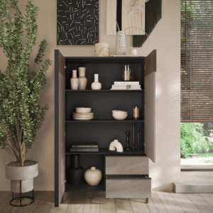 La madia alta moderna Everest è caratterizzata da un design elegante con 2 ante e 2 cassetti, nelle finiture Lava, Argilla e Mercure. Le sue dimensioni di 106×177 cm la rendono perfetta per spazi moderni, offrendo un ampio spazio di archiviazione con uno stile raffinato.