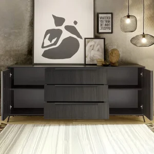 La madia moderna City è un elegante mobile per soggiorno con dimensioni di 205×84 cm, dotato di 2 ante e 3 cassetti. Presenta una finitura in nero frassinato, ideale per ambienti contemporanei, offrendo ampio spazio di archiviazione con un design sofisticato e funzionale.