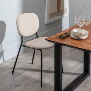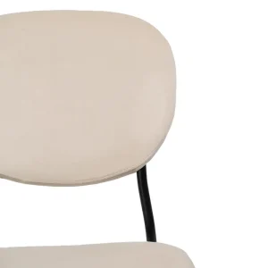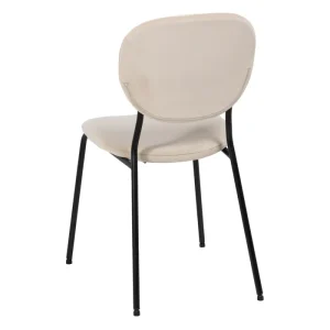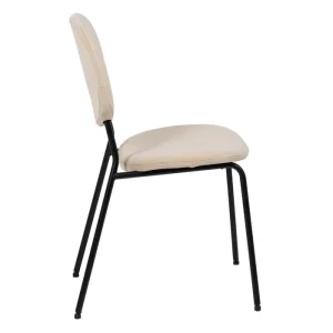Sedia in MDF rivestita con tessuto beige e struttura in metallo nero. Una sedia semplice che si adatta a molti ambienti, con un colore neutro