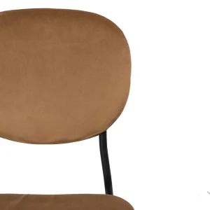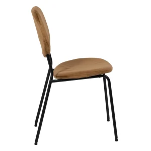 Sedia in MDF rivestita con tessuto marrone e struttura in metallo nero. Una sedia semplice che si adatta a molti ambienti, con un colore neutro